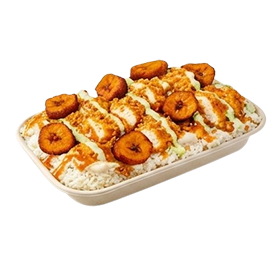 Riz blanc, sauce crousty, sauce verte, tenders & alloco, oignons crispy, persil.